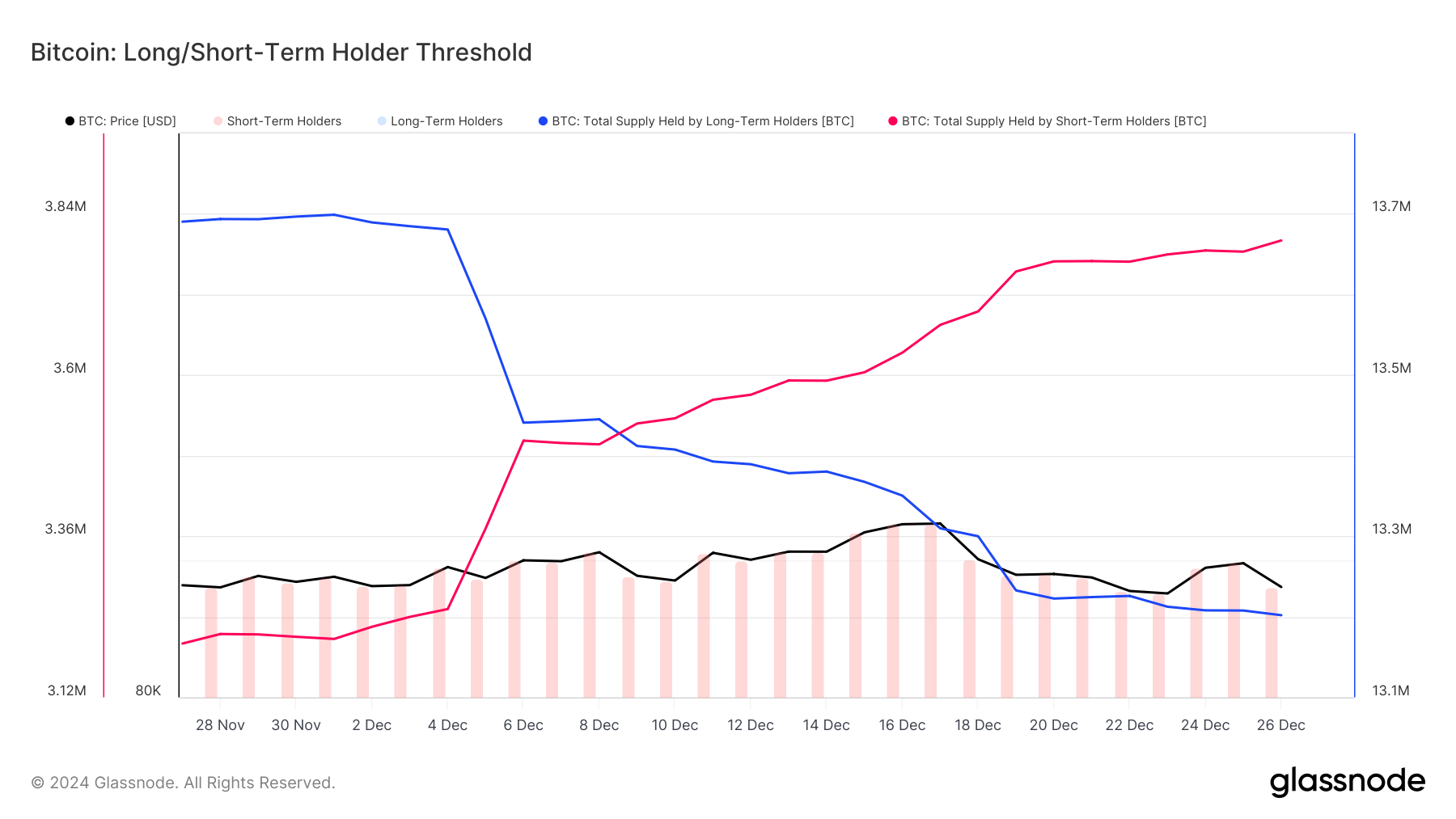 根据链上 数据 ,本周比特币的长短期持有者数据显示,随著价格上涨,短期持有者(红缐)持仓量显著增加,而长期持有者(蓝缐)持仓量则持续减少,特别是在 12 月初比特币价格多次试探十万美金大关时。