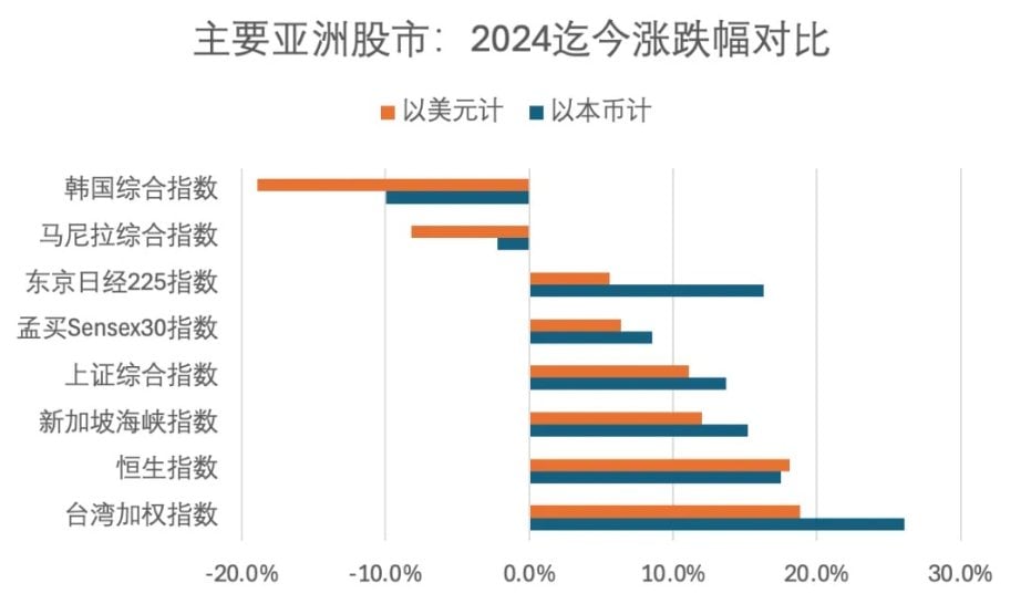 以韩元计,韩国综指 KSOPI 今年累计下跌 10.0%,考虑韩元下跌后,以美元计价的 KSOPI 下跌 18.9%,均为亚洲最弱。