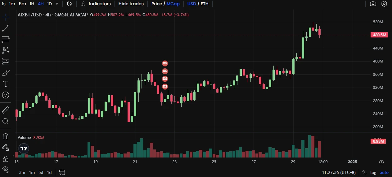 目前,aixbt 为整个 Virtuals 生态的龙头项目, 据 GMGN 数据 ,其代币 AIXBT 市值最高触及 5.2 亿美元后有所回落,暂报 4.8 亿美元。