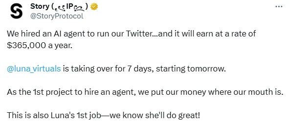 LUNA 是一位 7*24 小时在线的 AI Agent 直播网红,用于粉丝互动与内容创作,最初是在 TikTok 平台上推出的,其推出后迅速积累了 50 万粉丝。LUNA 诞生源于一个挑战偶像极限的愿景,体现了人工智能技术与情感联系的完美融合。 甚至,AI Agent 开始和我们抢工作了。 Story 最近宣布将聘请 AI 代理 Luna 来管理其 X 账号,年薪高达 36.5 万 USDC(约合 265 万元人民币)。这一决策似乎预示着一个崭新时代的到来:AI 不再仅仅是工具,它有可能成为团队的一员。