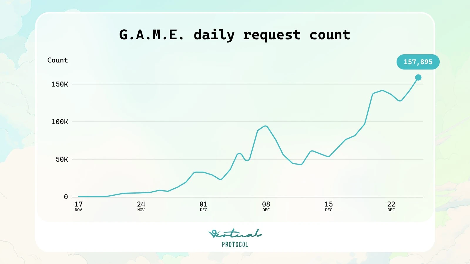 根据 Virtuals Protocol 公布的最新数据 ,在 GAME 供 Virtuals 生态 AI Agent 构建者的一个多月时间里,使用 GAME 建设的项目超过 200 个,周增长 200% ,总市值超过 5 亿,且目前每日在 GAME 上发送请求超 15 次。