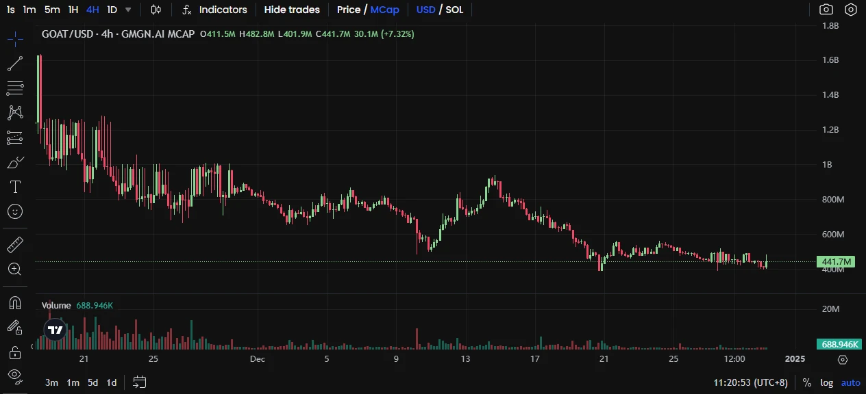 据 GMGN 数据 ,GOAT 市值从高点 16 亿美元持续下跌,暂报 4.4 亿美元。