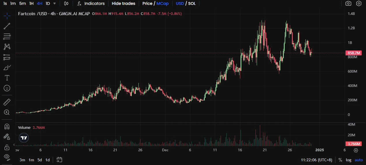 据 GMGN 数据 ,FARTCOIN 市值最高突破 12 亿美元后出现回调,暂报 8.6 亿美元。