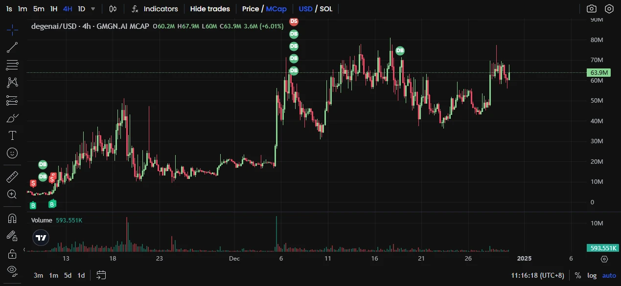 据 GMGN 数据 ,degenai 市值最高触及 8000 万美元,暂报 6300 万美元。