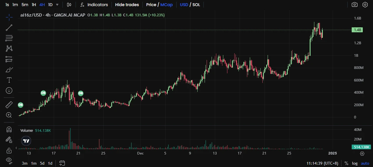 据 GMGN 数据 ,ai16z 市值近期持续创历史新高,目前有小幅度回调,市值暂报 14 亿美元。