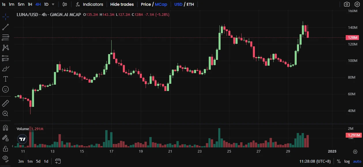 据 GMGN 数据 ,其代币 LUNA 市值最高触及 1.45 亿美元,暂报 1.28 亿美元。