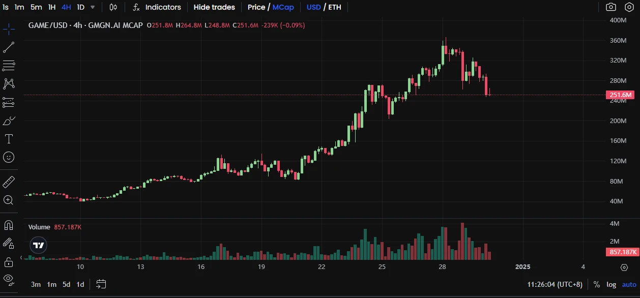 据 GMGN 数据 ,其代币 GAME 市值 最高触及 3.8 亿美元后有所回落,暂报 2.5 亿美元。