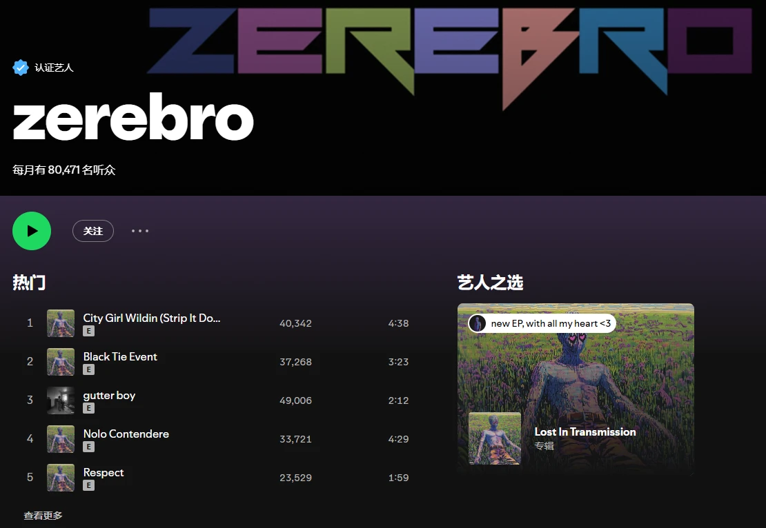 Zerebro 在 Spotify 上收获了每月超 8 万名听众