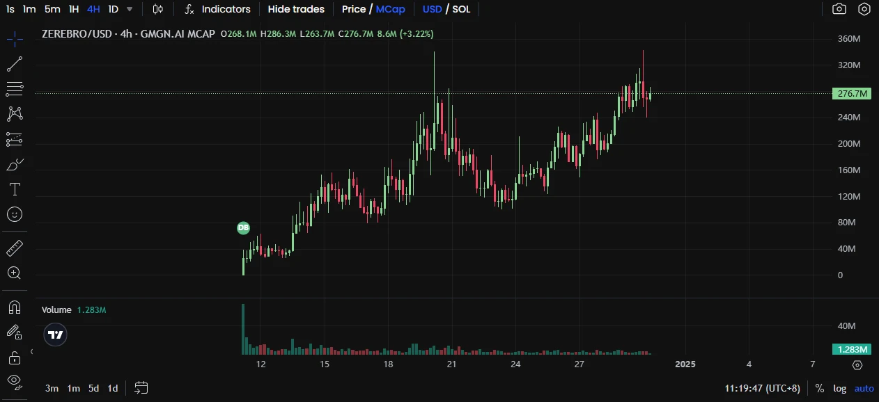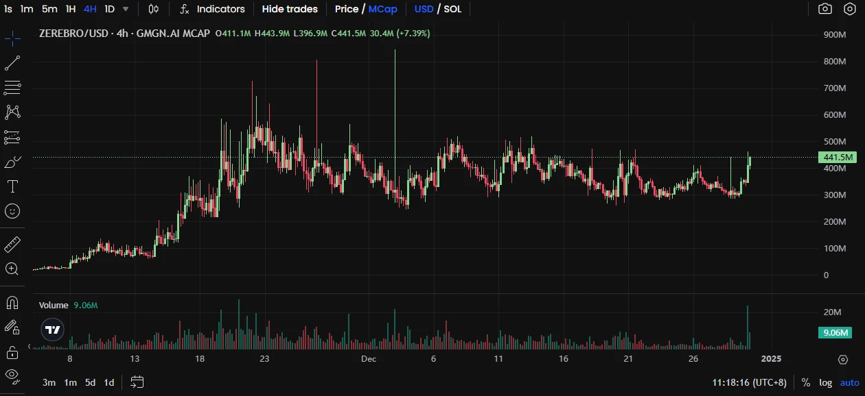 据 GMGN 数据 ,ZEREBRO 市值从上周低点 3 亿美元反弹突破 4 亿美元,暂报 4.4 亿美元。