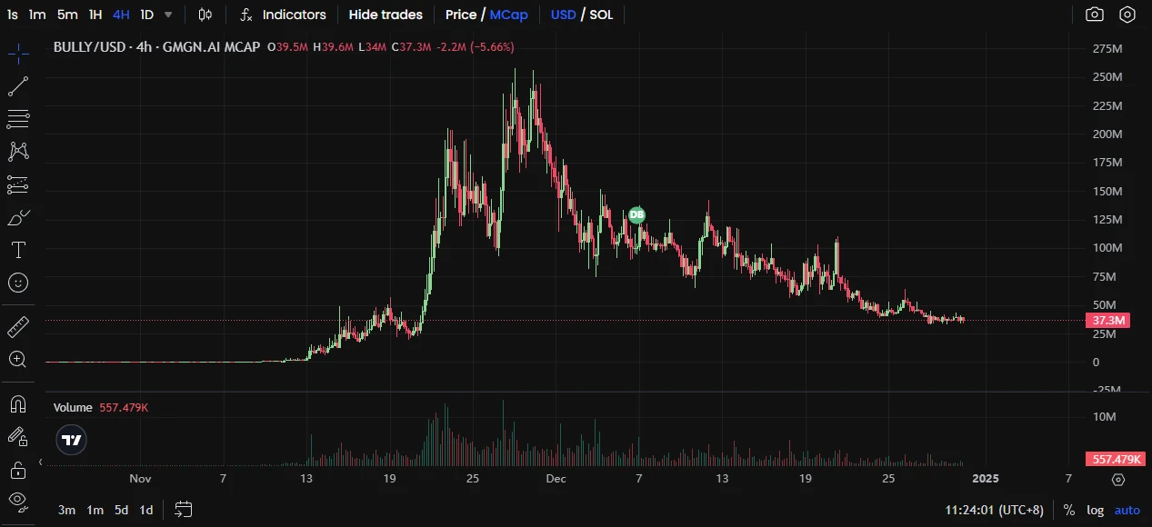 据 GMGN 数据 ,BULLY 市值从高点 2.5 亿美元持续下跌,暂报 3700 万美元。