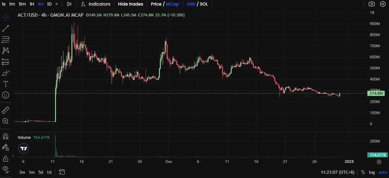 据 GMGN 数据 ,ACT 市值从高点 8 亿美元上方持续下跌,暂报 2.7 亿美元。