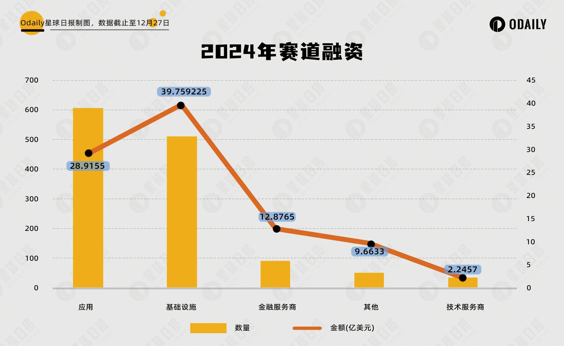 据 Odaily星球日报不完全统计, 2024 年全球加密市场共发生 1295 起投融资事件(不含基金募资及并购),已披露总金额为 93.46 亿美元,分布在基础设施、技术服务商、金融服务商、应用和其他服务商赛道,其中应用赛道获得的融资数量最多,共计 606 笔;基础设施赛道获得的融资金额最多,融资金额为 39.76 亿美元。两者在融资金额和数量上领先其他赛道。