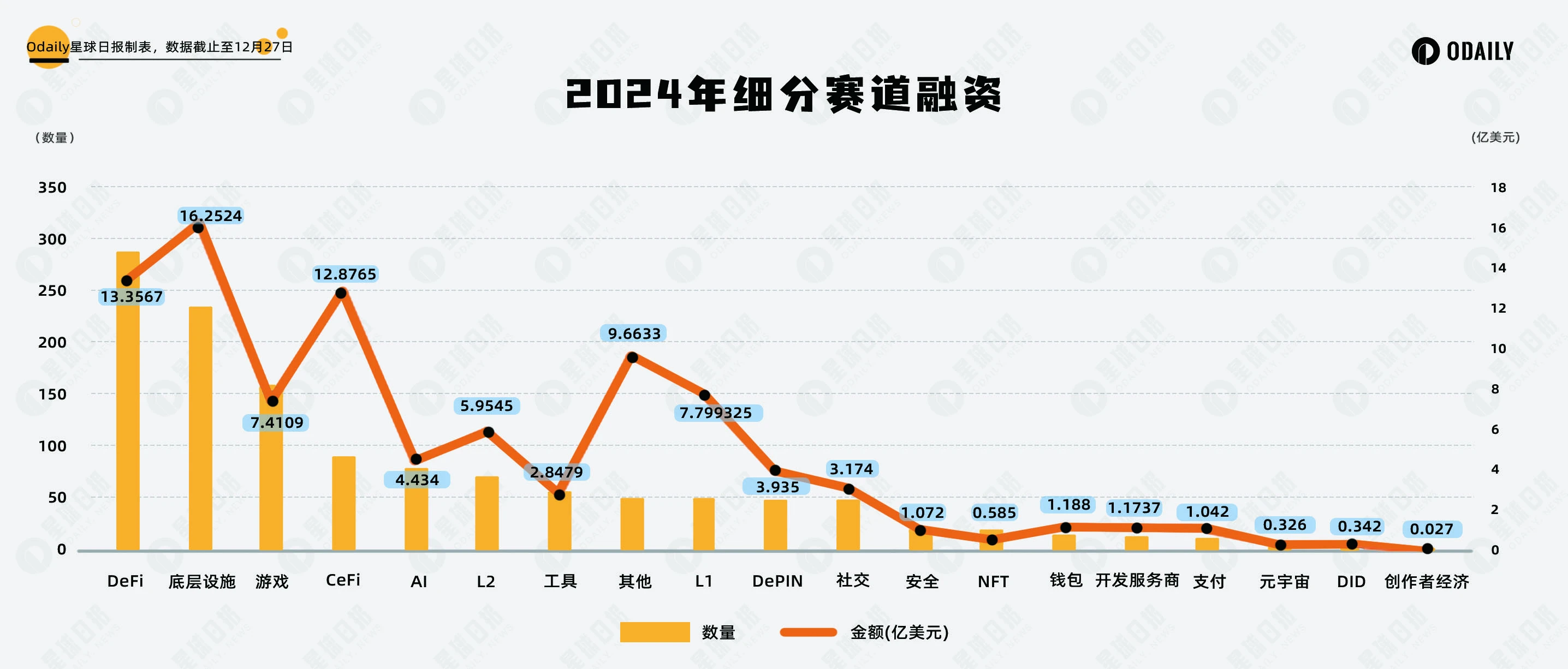 据 Odaily星球日报不完全统计, 2024 年细分赛道中融资事件集中在 DeFi、底层设施和游戏,其中 DeFi 赛道为 289 笔,底层设施赛道为 236 笔,GameFi 赛道为 160 笔。
