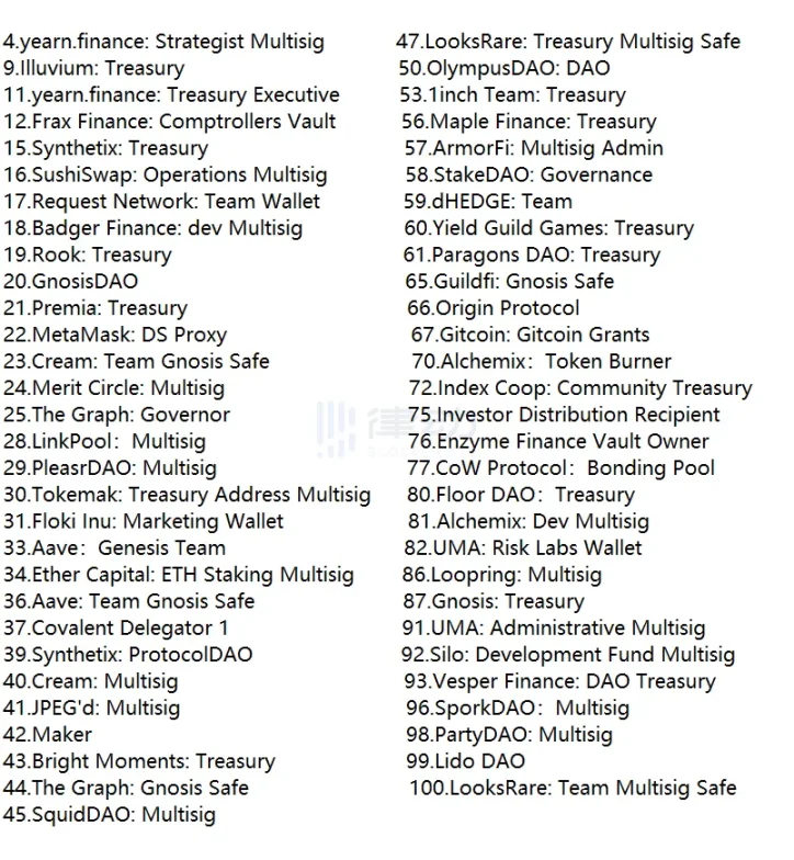 作为 Gnosis 全家桶中的明星产品,Safe 是以太坊生态中最受欢迎的多重签名钱包,也是大户专用钱包。在今年 Safe 发币时,空投地址前 100 的名单里,几乎清一色都是项目方或是机构。