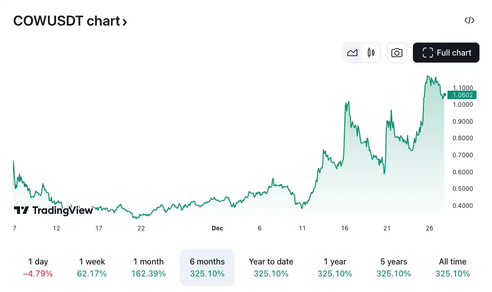 这种特殊的链上行为也直接影响了市场情绪,在川普即将上任的「前夜」和政治概念币火热的双重预期下,$COW 币价在短短一周内暴涨 62%,并在一个月内飙升了 162%。