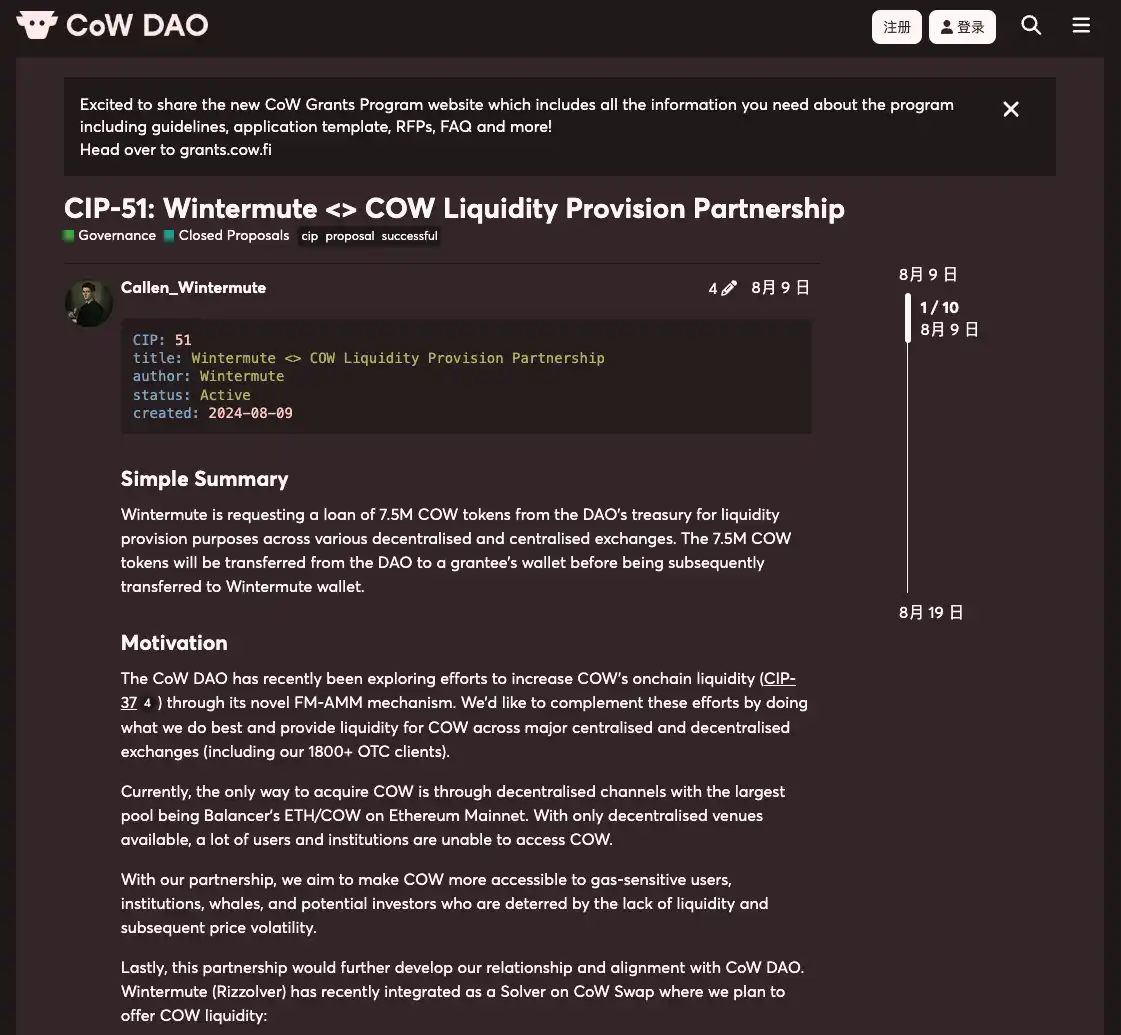 Wintermute 提议从 CoW DAO 的财库中借出 750 万个 COW 代币,用于支持去中心化和中心化交易平台的流动性。这项提案得到了社区的大力支持,并正式开启了 $COW 流动性的新篇章。