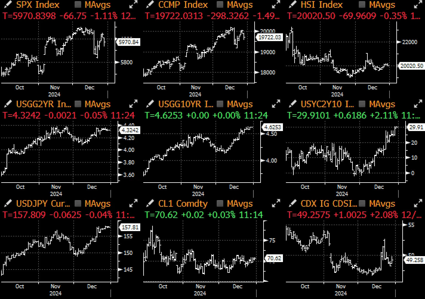 2024 年已经接近尾声,今年的最后几个交易日比预期的更为重要。虽然英国央行和日本央行如市场预期地维持利率不变并倾向鸽派立场,但美联储的“鹰派降息”以及对隔夜逆回购利率的技术性调整令市场感到意外,这表明年底流动性条件将收紧。