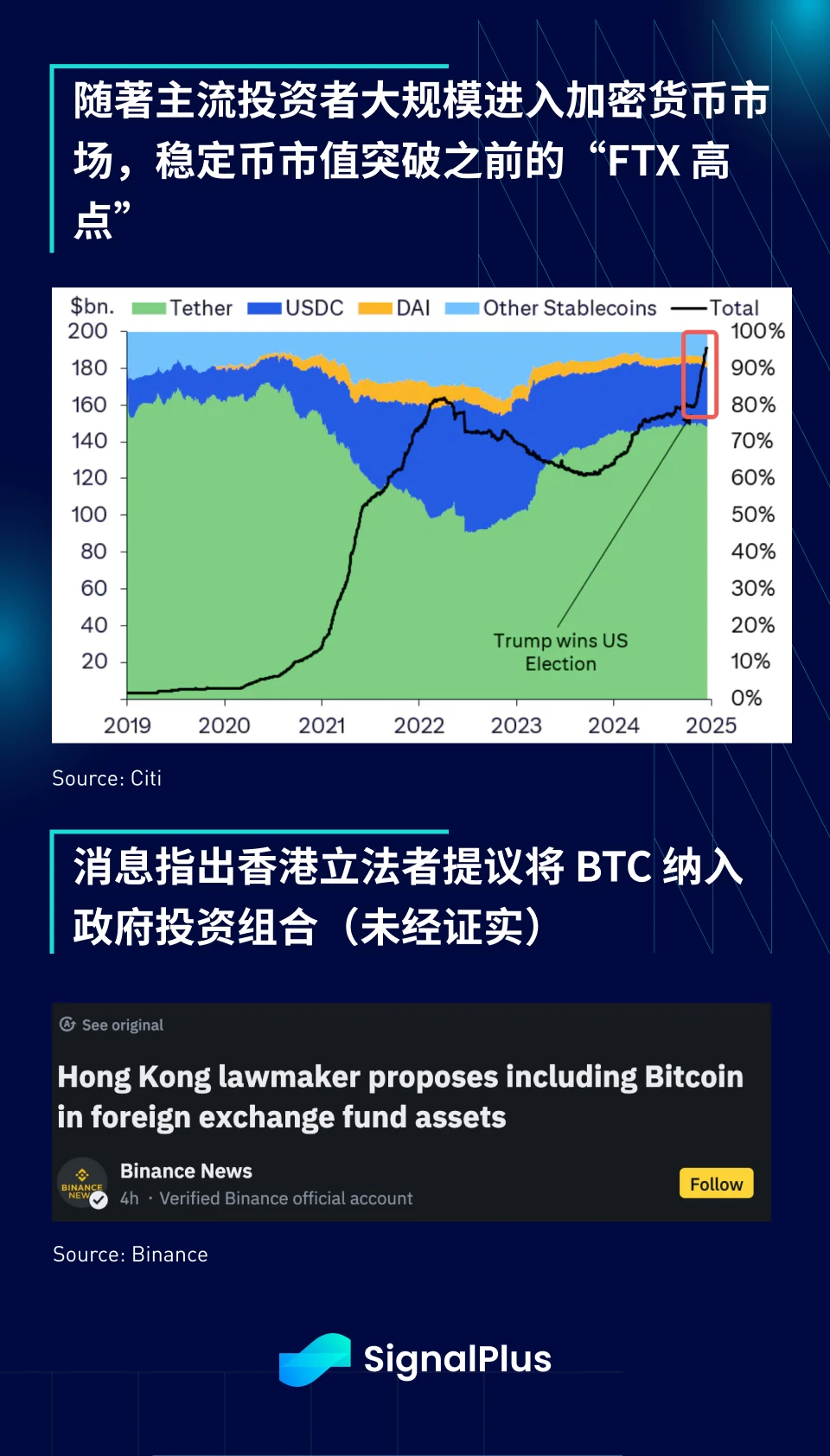 此外,以稳定币市值作为指标,自 Trump 当选以来,主流资金已大规模重新进入加密货币市场,目前稳定币市值接近 1, 900 亿美元,远超 2022 年 FTX 时期的高点。同时,各国政府对 BTC 储备的讨论也日益流行,未经证实的媒体报导指出,香港立法者最近提议政府应考虑将 BTC 纳入外汇储备组合。