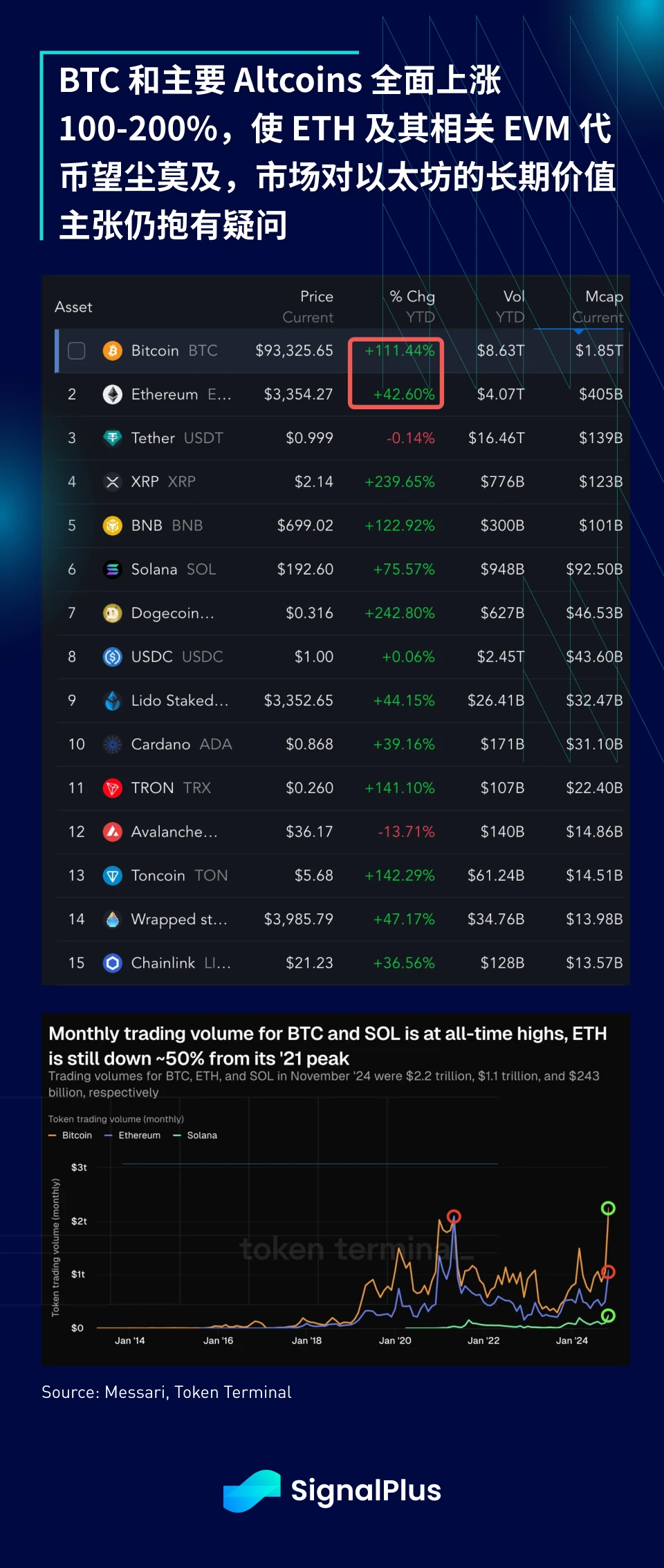 加密货币今年的涨幅最初由 BTC 带动,其主导地位从 40% 的低点升至超过 60% 。整体而言,今年的市场活动由三个重要阶段组成:第一季度,现货 ETF 的批准带动显著涨势;第二季度和第三季度,市场活动平淡且缺乏延续动能,导致走势横盘;最后,Trump 的再次当选使 altcoins 重新成为市场主导力量,推动了近期的涨势,XRP 和 Dogecoin 全年涨幅超过 200% ,而其他主要 altcoins 的涨幅也有 150% 左右,这使得 ETH 今年迄今 40% 的涨幅相形见绌。