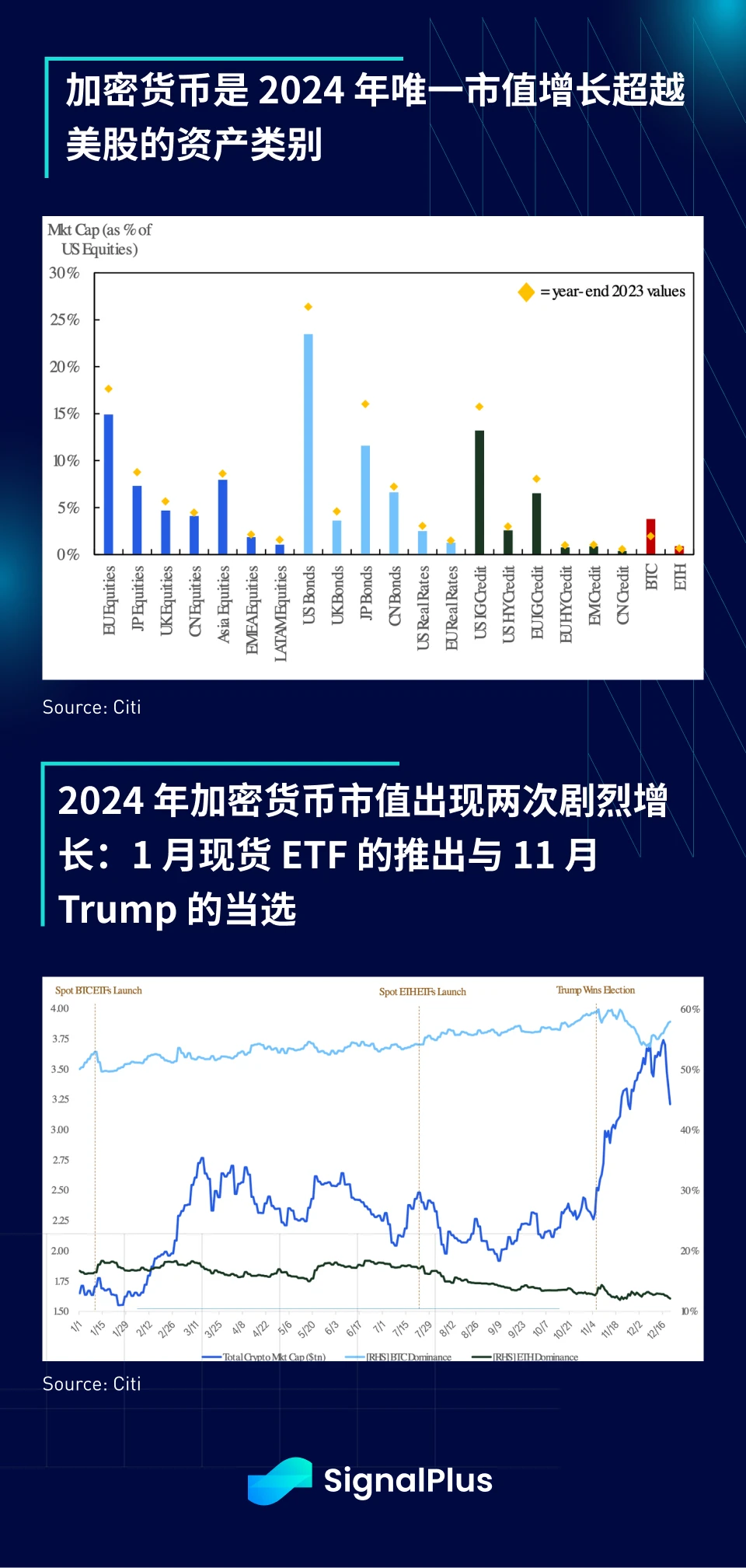 在加密货币领域, 2024 年无疑能载入史册,加密货币市值年内上涨超过 90% ,从 1.65 万亿美元增长至 3.2 万亿美元。令人难以置信的是,加密货币是 2024 年唯一在市值增长基础上超越美股的资产类别,得益于 1 月份推出的现货 ETF 以及 Trump 当选后的监管乐观情绪。