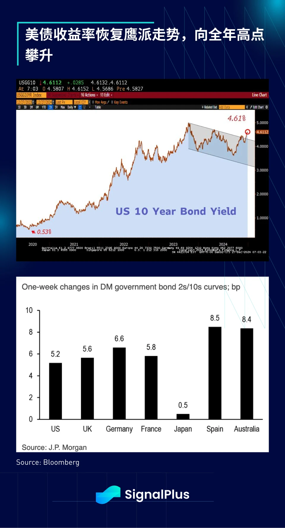 一系列鹰派消息带来了显著的风险负面效应,SPX 指数下跌 200 点,美债收益率曲线呈现熊陡走势, 10 年期收益率突破下行通道,正朝著年内高点迈进,仅过去一周就上升了 15 个基点。
