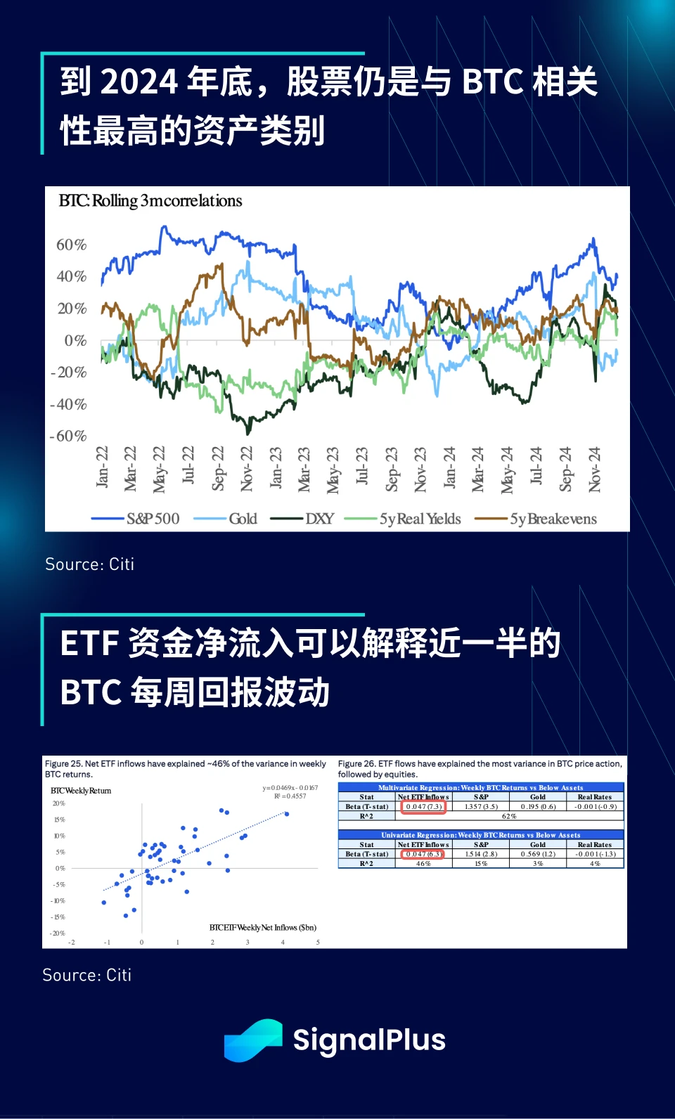 主流市场对加密货币的影响最能体现在 BTC 与 SPX 指数的高相关性上,到 2024 年底,SPX 指数仍是与 BTC 相关性最高的资产类别。此外,花旗的研究表明,ETF 的资金流入可以解释近一半的 BTC 周回报率波动,且这一趋势很可能将延续至新的一年。