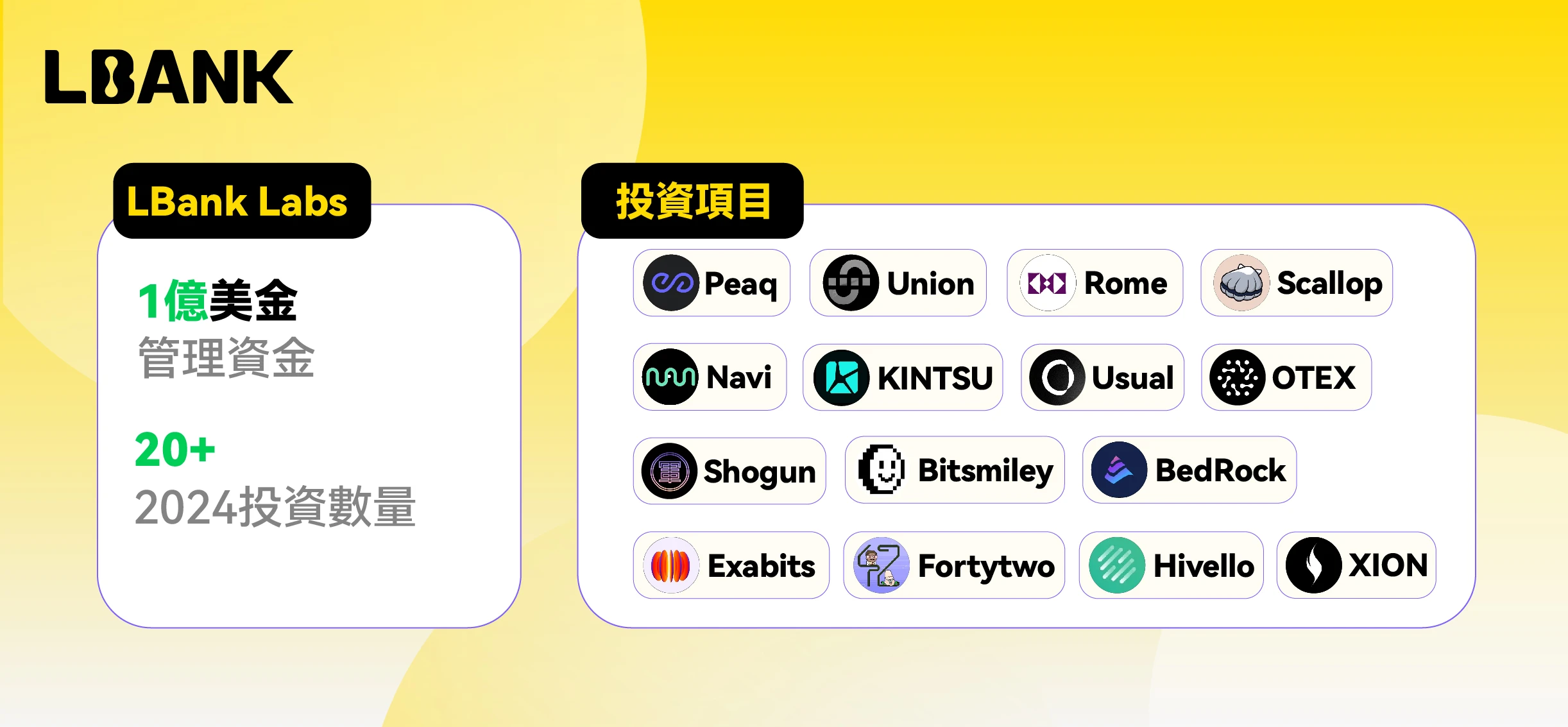 LBank Labs 专注于发掘优质资产,现管理资产规模达 1 亿美元,累计投资了超 20 个优质项目,包括 Rome、KINTSU、XION、Usual Labs、Union、BedRock 等。 Labs 不仅为这些专案提供强大的资源支持,还建立了深度合作网络,确保在新的叙事循环和市场周期中保持稳健成长与创新。