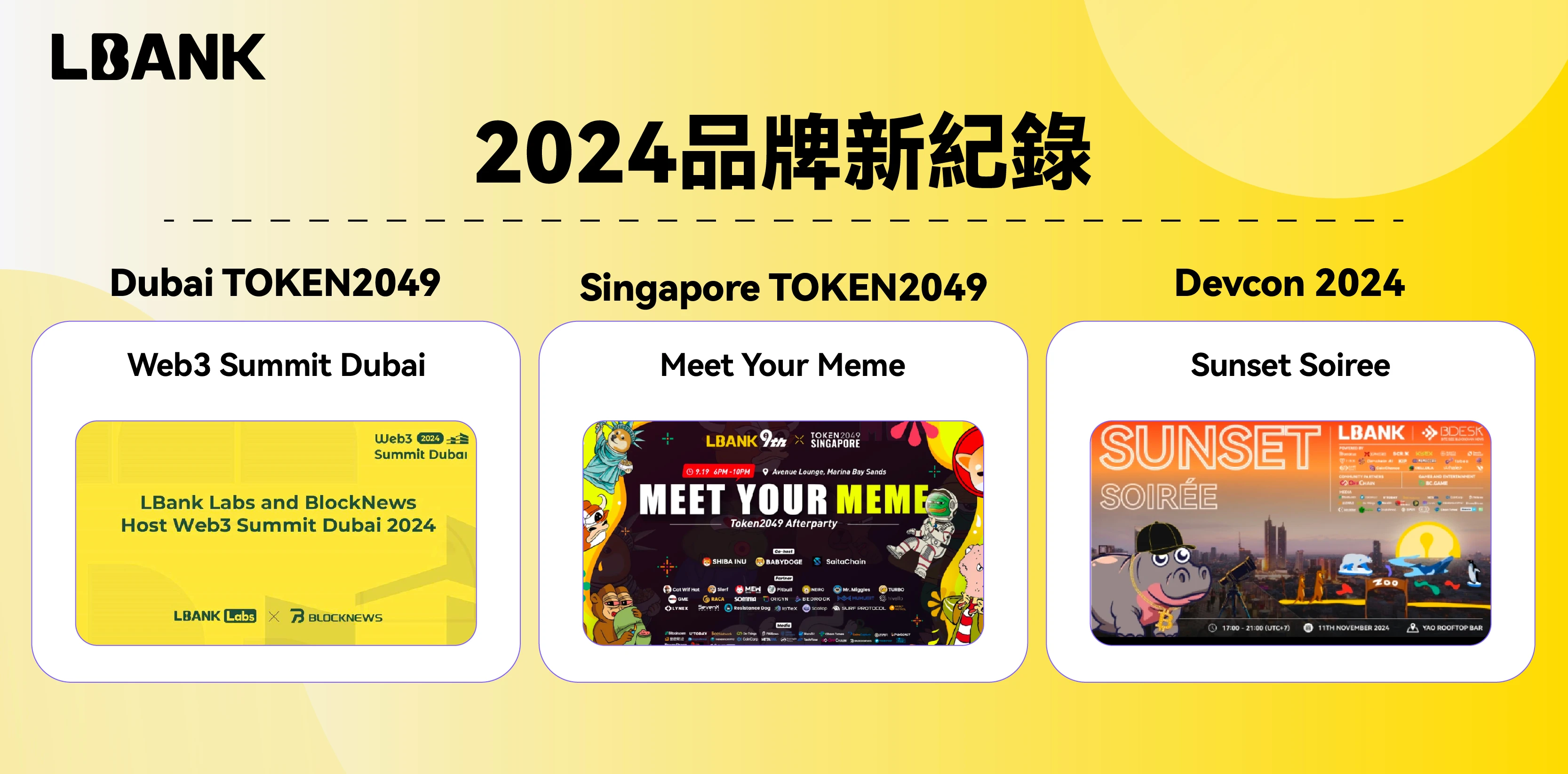 回顾 2024 ,LBank 从迪拜 TOKEN 2049 ,到新加坡 TOKEN 2049 的 meme 盛宴,再到曼谷的 Sunset Soiree,LBank 正在以全新姿态进行非常规化的市场品牌推进。