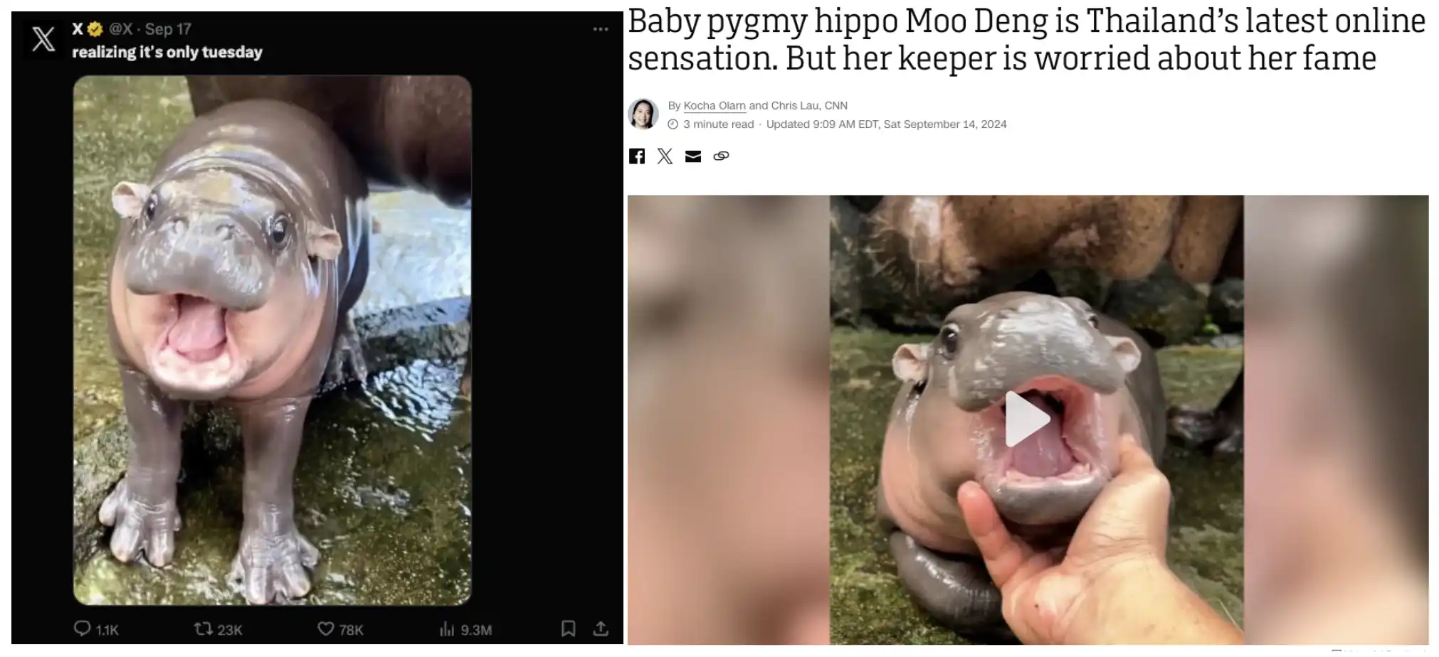 「可爱」、「丑萌」一直是广大网友喜闻乐见的形象,也是 meme 市场经久不衰的热点。9 月,一只叫 Moo Deng 的小河马火遍全网,成为各路媒体头条,它诞生于一家泰国开放动物园 Khao Kheow,由于其可爱的表情和丑萌的形象很快就在 TikTok、Instagram 上走红。