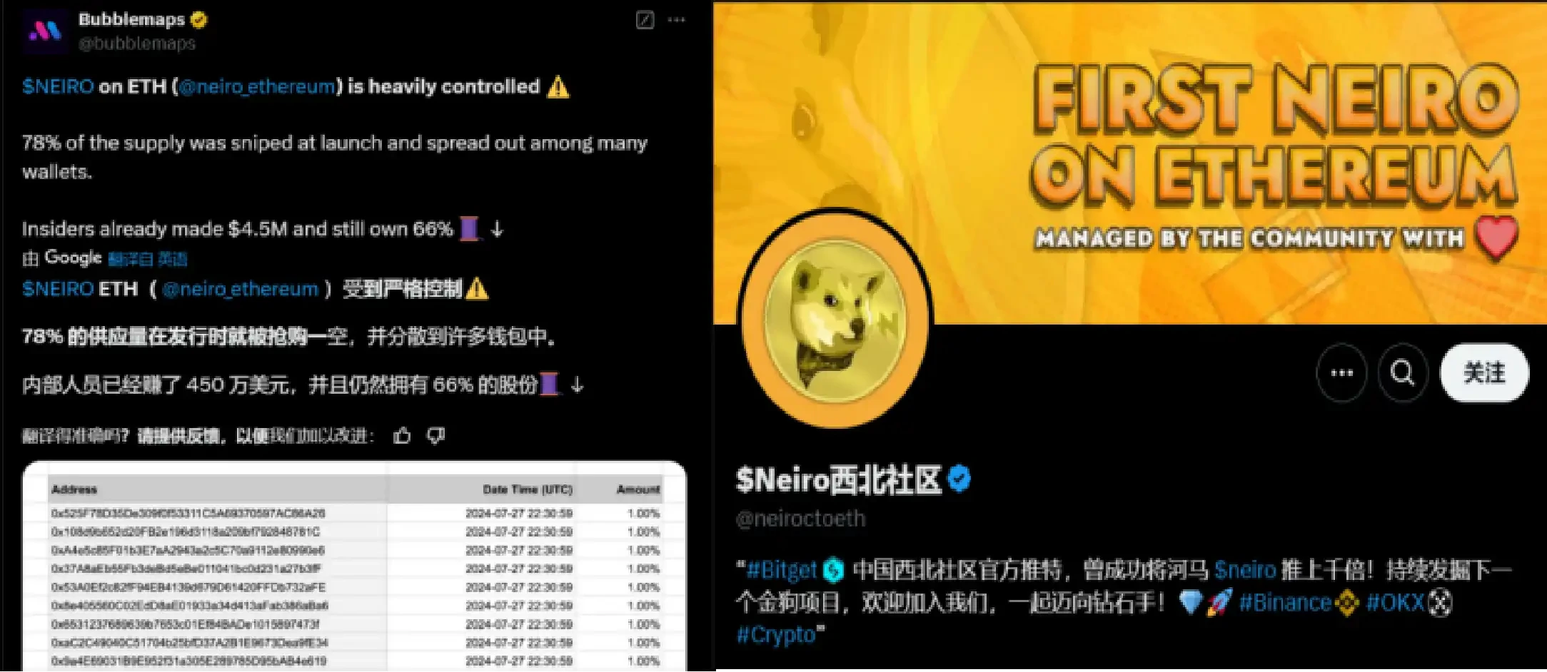 Neiro 灵感来自现实生活中的同名柴犬,被称为 DOGE 的继承者。7 月 31 日,大写 NEIRO 在上线一周后就被 bubblemaps 发推揭露是名副其实的阴谋集团,而小写 Neiro 则更加社区化,在前期一直不温不火,直到 Vitalik 公开表示支持并向动物福利基金捐赠了超过 50 万美元,靠社区宣传的力量慢慢价格才走起来。