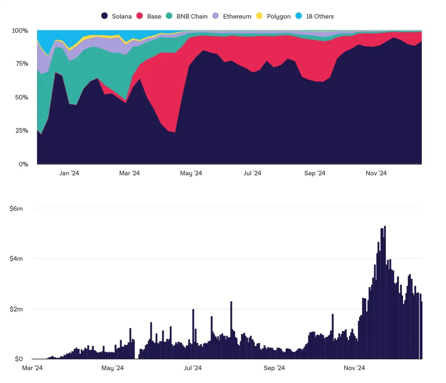 上:公链新代币发行占比,下:Pump.fun 手续费收入;数据来源:The Block