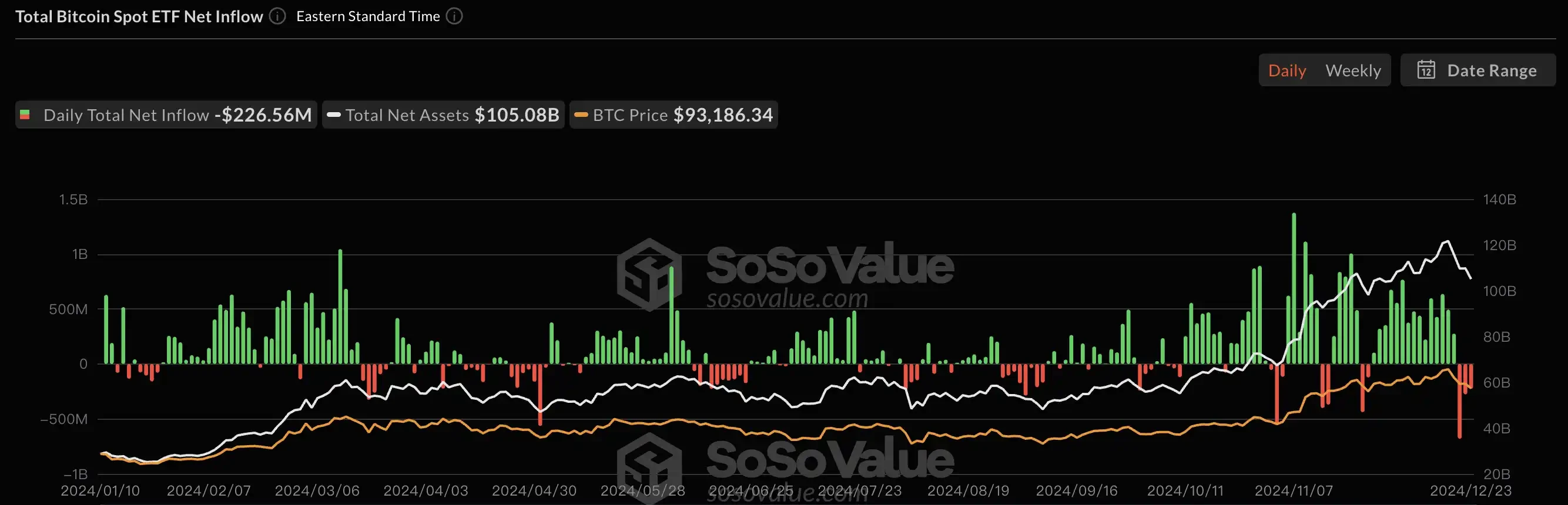 2024 年比特币现货 ETF 流入流出情况;图源:SoSoValue