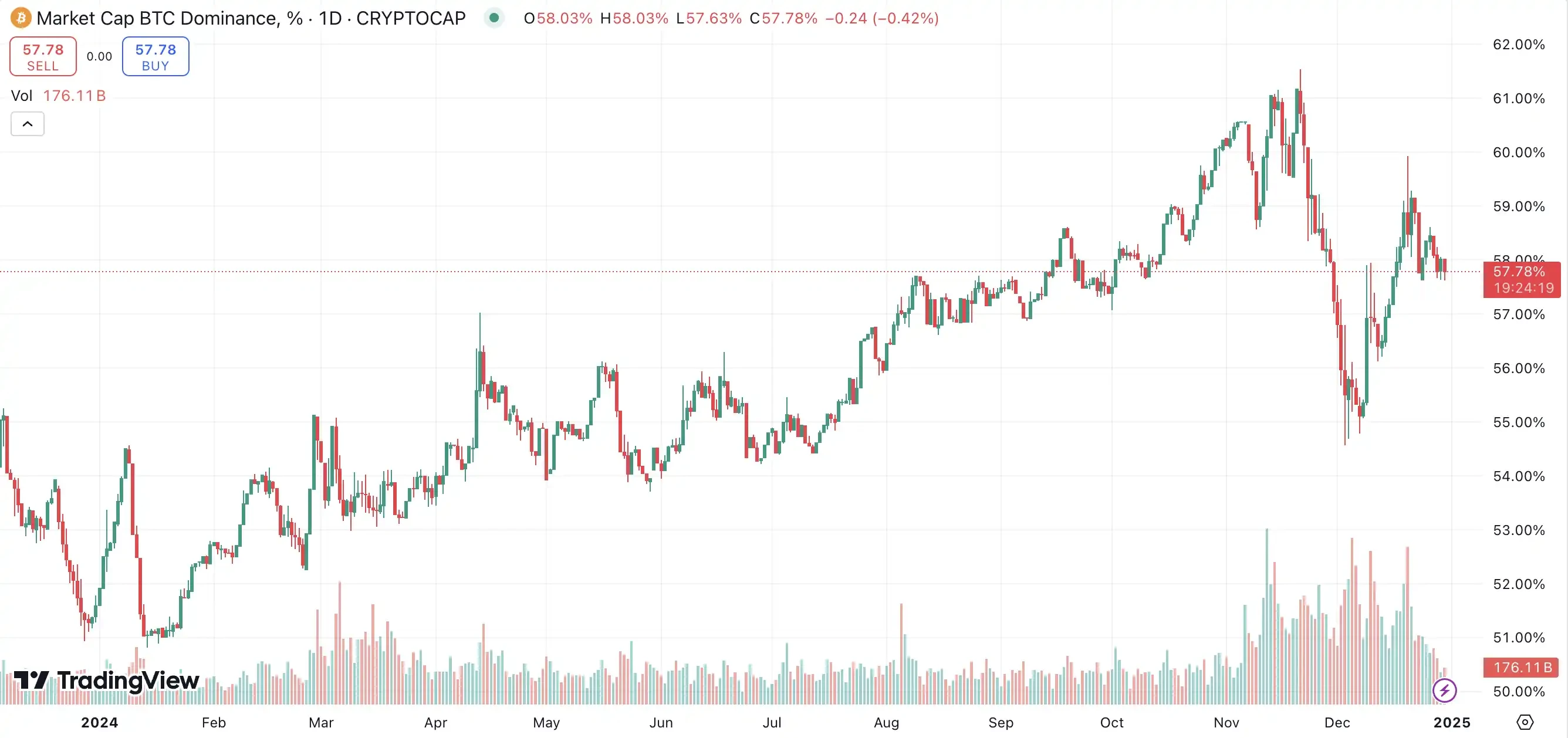 比特币市占率的变化一直是观察加密行业市场动态的重要指标, 2024 年比特币市占率从年初一路攀升至 61% ,与此同时,投资者感叹并没有多少资产能在今年跑赢比特币,山寨币的价格表现也让圈内人频频感叹本轮周期操作难度之高。