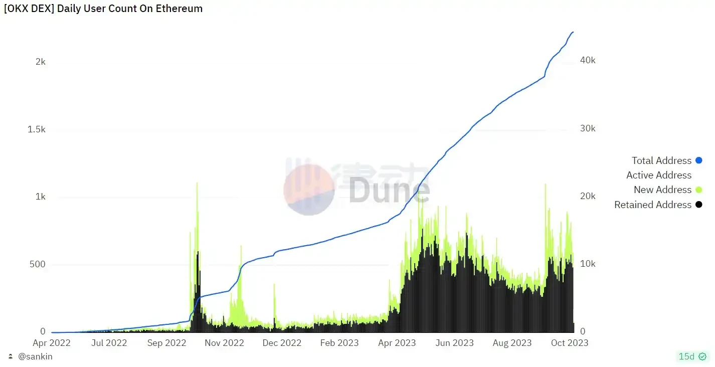 2023 年底 OKX 钱包地址增长,数据来源:Dune Analytics