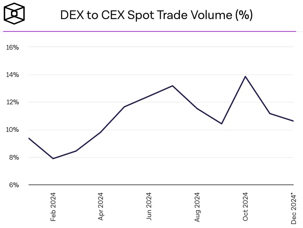 今年 7 月,The Block 发布了一份数据统计,DEX 与 CEX 现货交易量的市场比率在年中来到了 13.76% ,超过 2023 年 5 月的 13.7% ,创下历史新高。6 月份,CEX 交易量为 1.11 万亿美元,同期 DEX 交易总量则为 1230 亿美元,而短短 3 个月后,这个数字便翻了一番,在 10 月份达到近 3000 亿美元。