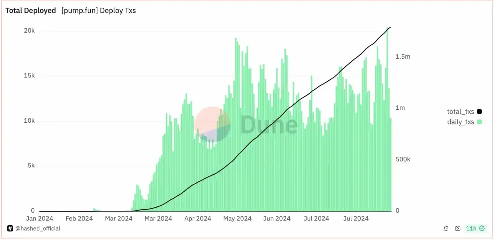 根据 Hashed 提供的 Dune 仪表盘数据,从 3 月份开始,pump.fun 平台上部署的代币逐渐增多,每日平均新增代币部署数量在 1 万左右,目前累计已部署代币数量接近 180 万个。