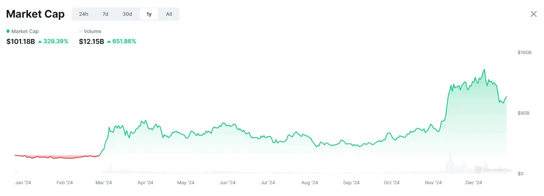 meme 币 2024 年总市值变化;图源:CoinMarketCap