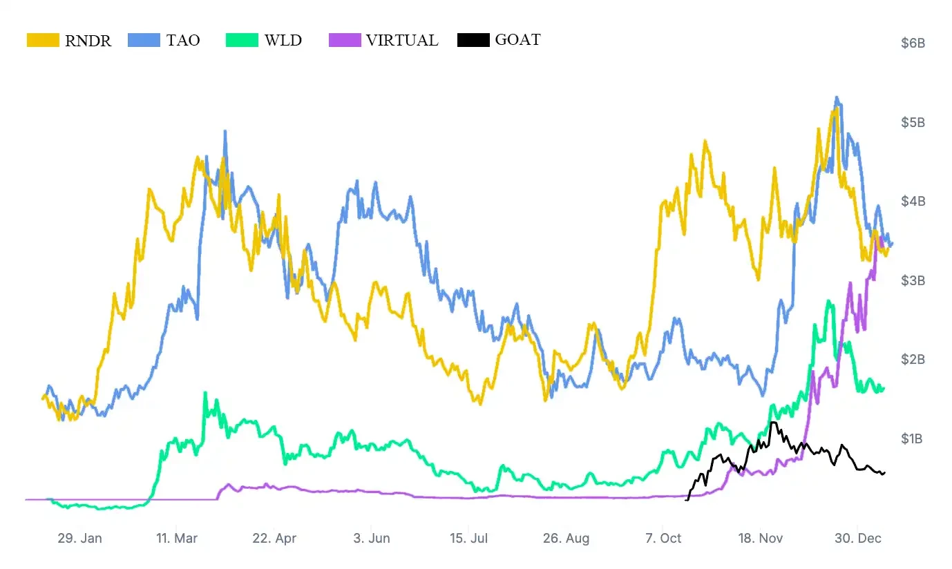 2024 年 AI 板块相关代币市值走向;