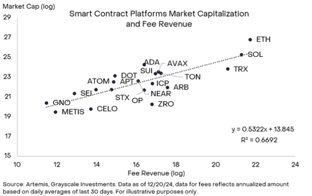 如图 4 所示,智能合约平台费用收入与市值之间存在统计关系。网络产生费用收入的能力越强,网络以代币销毁或质押奖励的形式将价值传递给网络的能力就越大。 本季度,Grayscale Research 列出的 Top 20 代币列表包含了一些智能合约 平台代币:ETH、SOL、SUI 和 OP。