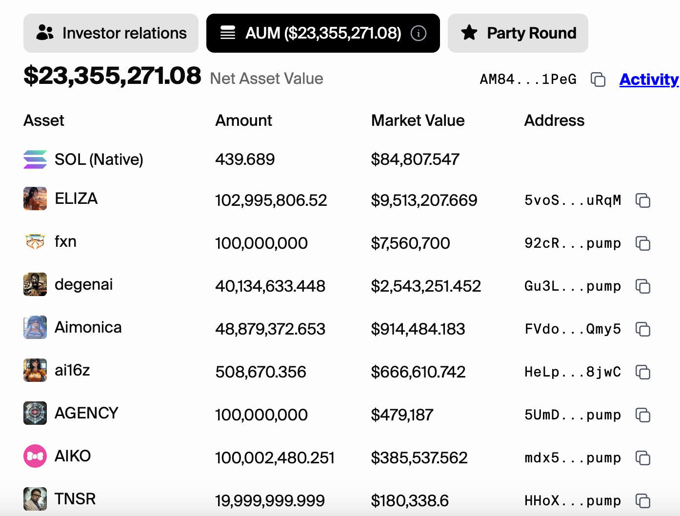 根据daos.fun数据显示,截至12月30日,ai16z的净资产价值(NAV)约为2335.5万美元,涵盖超过1400个代币。在这些代币中,市值规模超百万美元的代币仅为3个,分别是ELIZA、fxn和degenai,三者的累计市值占整体的84.3%;资产规模在10万至100万美元之间的代币则有6个,其余代币的市值均低于10万美元。这一分布情况表明,ai16z的代币组合呈现出较为集中化的特点,少数高价值代币主导了整体资产规模,而大多数代币的市值较为分散,显示出该生态仍处于高度分化的状态。