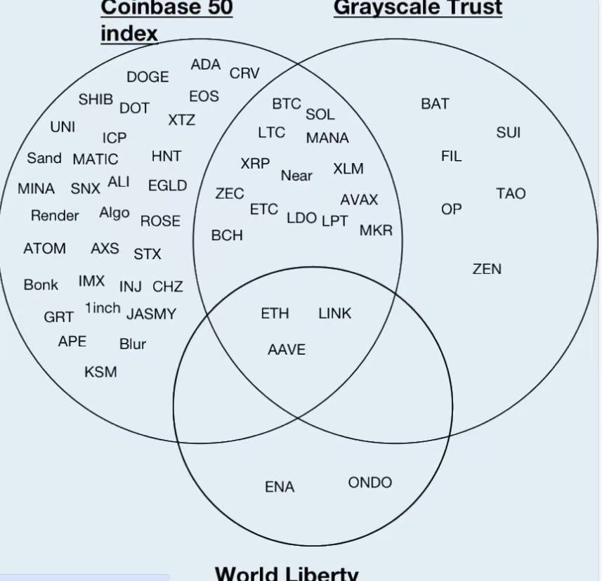 另外值得一提的是,在灰度最新的 2025 Q1 TOP 20 名单中,包括 LINK、AAVE、ENA 等代币也是美国当选总统川普相关加密货币项目 WLFI 重点持仓代币,同时还包含了美国上市交易所 Coinbase 的 COIN50 指数中的部分代币。