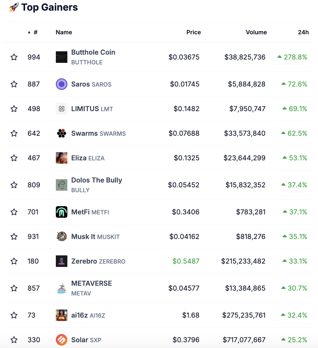 - ai16z:从第一个 AI 投资 DAO 起家,现在也乘载整个「Eliza 生态(利用 ELIZA 框架𫔭发的 AI Agents 会将代币空投给 ai16z 管理的基金 )」的网路效应成长,连续几日的屡刷新高估计与团队释出的 代币经济学提案 有关。近 24 小时上涨 32.4%,市值突破 19 亿美元。