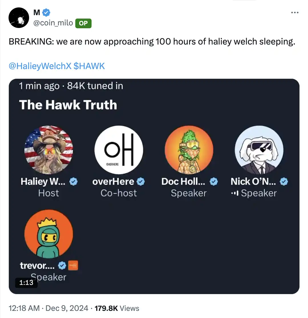 30、在 $HAWK 上线后,@HalieyWelchX 和她的团队开启了一场 Space,向投资者解释发生了什么。@chooserich 加入讨论并开始发言,而 Haliey 回复说她累了要去睡觉,随即突然结束了空间。之后她足足睡了两周才再次回应大家。