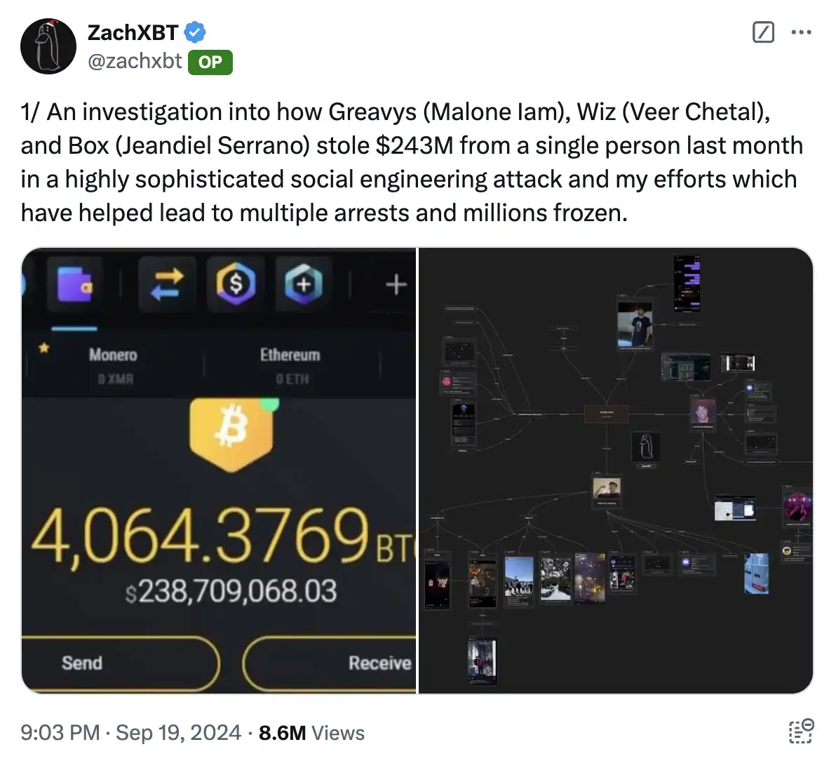 22、zachxbt 揭发一名名叫 Malone 的少年通过社会工程攻击从一人手中盗取了 2.43 亿美元。Malone 随后被发现出入夜店、乘坐私人飞机,并肆意挥霍这笔意外之财。