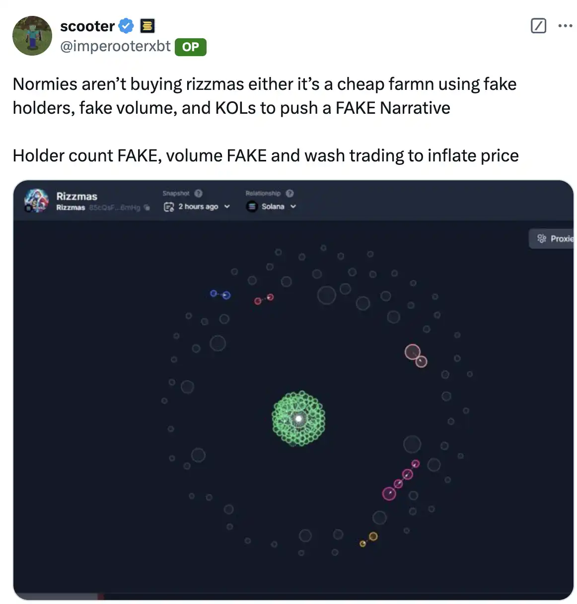 21、Scooter (@imperooterxbt) 揭露了 Rizzmas 完全是个骗局,导致其市值从 1 亿美元暴跌至 2000 万美元,随后遭到众多投资的 TikTok 用户怒喷。