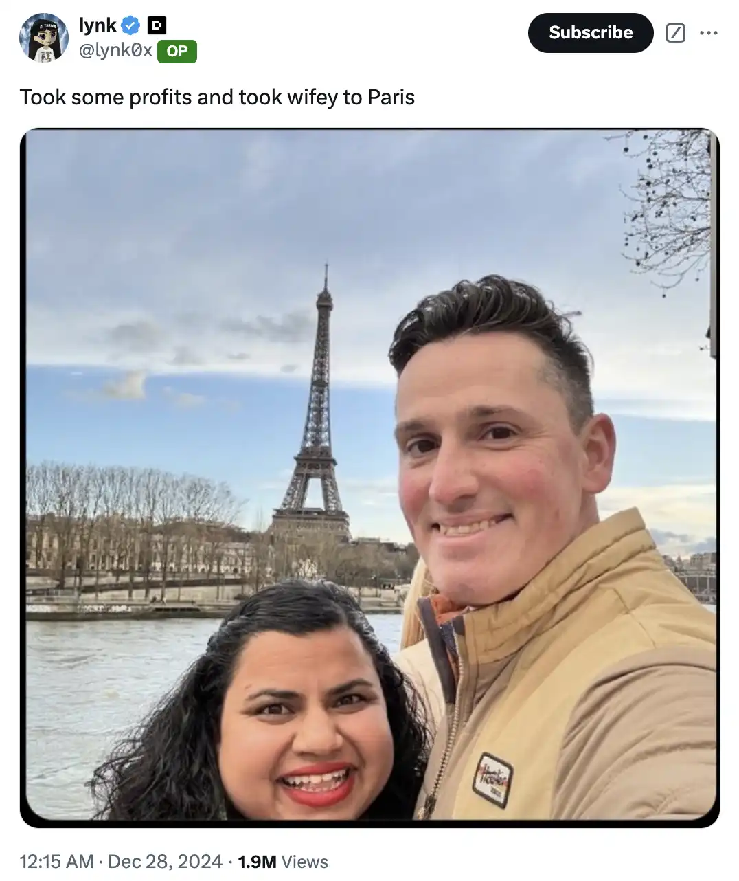 28、「赚了点钱,带老婆去巴黎了」的梗图(他重发了这个梗,但还是非常搞笑)。