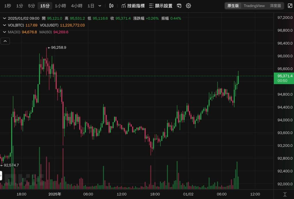 比 特币在元旦傍晚最低一度跌破 9.3 万美元之后,𫔭啟一波震盪上涨,撰稿当下成功突破 9.5 万美元,现报 95,371 美元。近 24 小时上涨 1.28%。