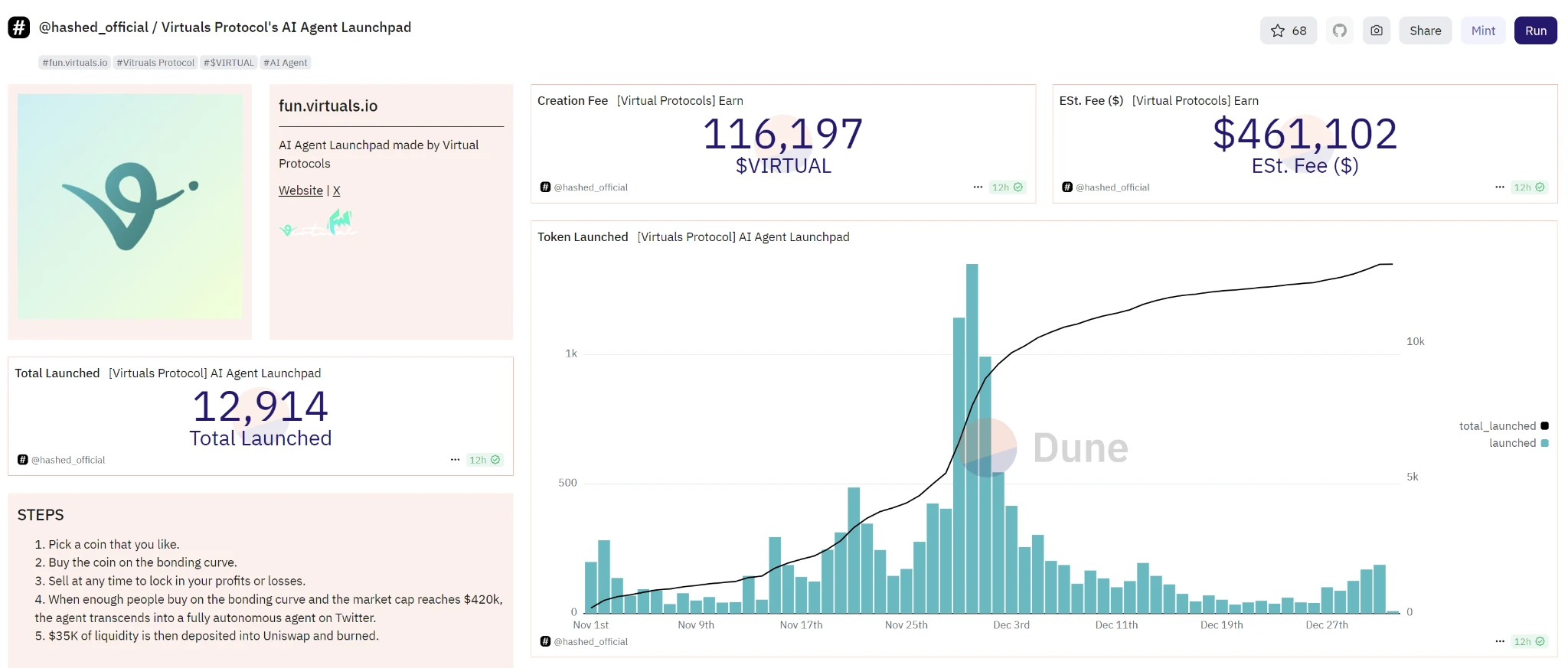 Virtuals 设计了初始代币发行(IAO)模式,用户能够通过锁定 $VIRTUAL 来生成新的 AI 代理,并且创建的代币会与锁定的 $VIRTUAL 自动配对,形成流动性池。据 Dune 面板 1 月 1 日数据,基于 Virtuals 推出的 AI Agent 已接近 1.3 万个。