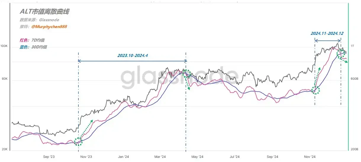 图 3 中红色为 7 D 均值,蓝色为 30 D 均值;从数据上看,在 2023.10-2024.4 和 2024.11-2024.12 这两段时间红线上穿蓝线,意味着币圈的流动性开始像山寨币倾斜,山寨币市值正在转向动量正增长阶段。