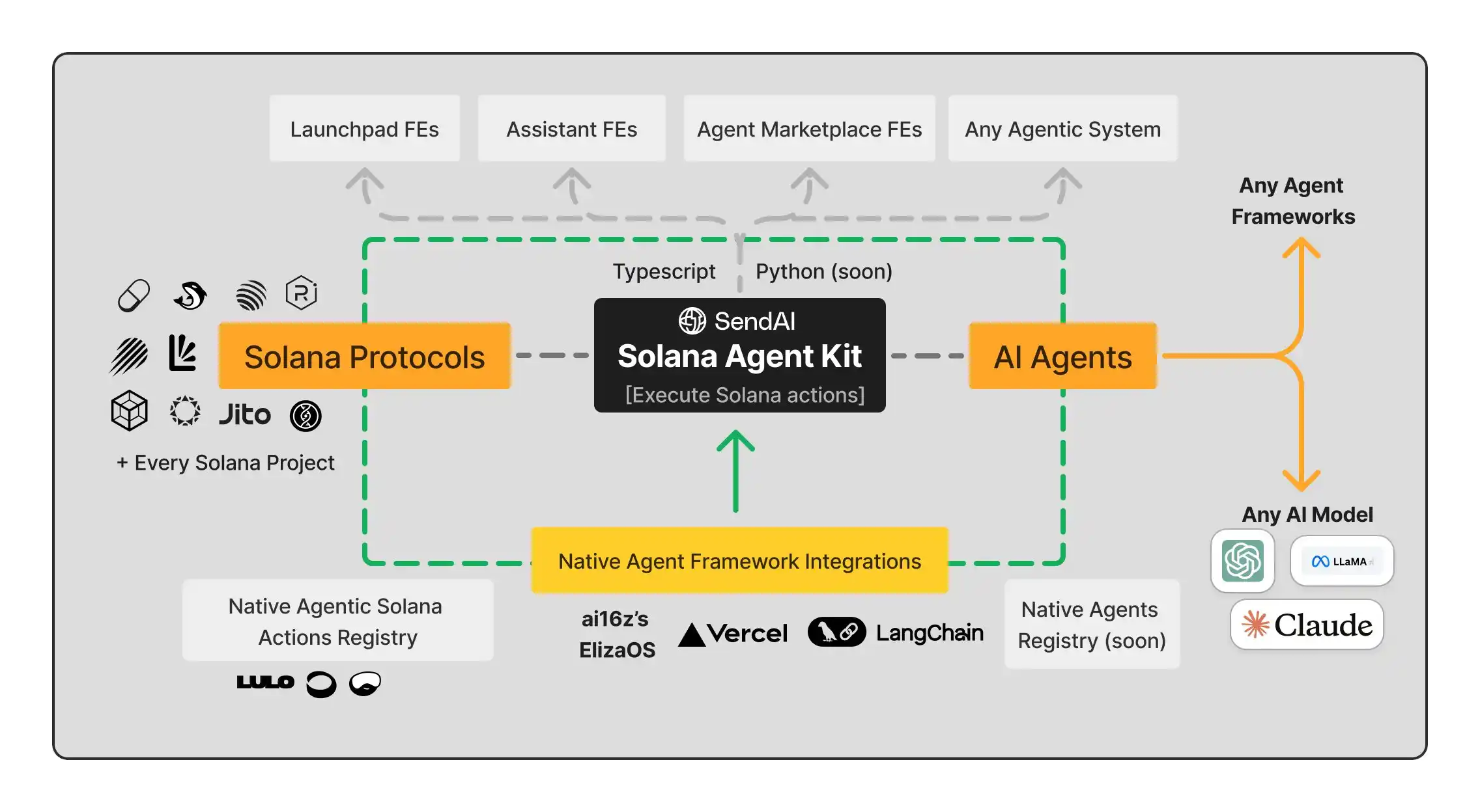 所以从技术开发层面来说,没有比让熟悉 blinks 开发和应用的 Send 团队来发展 Solana AI Agent 的基础设施更合适的团队了。他们拥有的丰富链上交互 API 和且能够使其与多网页客户端联通的经验。让他们的 Agent kit 除了同时支持多种语言架构的融合外还支持多交互模式的嵌入「Dialect 的 blinks、Send Arcade 的游戏」,使用他们工具的代理更容易与链上或社交媒体进行交互。
